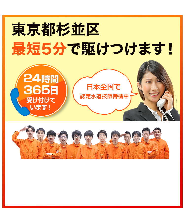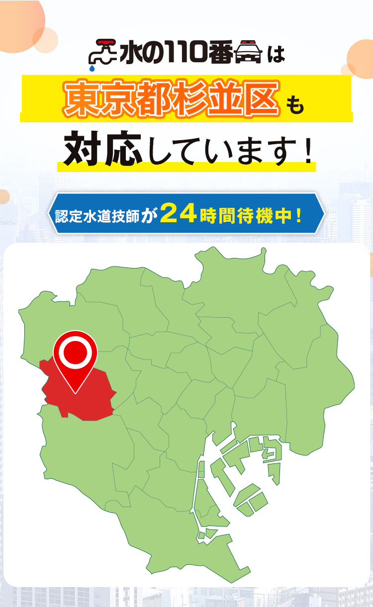 杉並区のトイレつまり・水漏れ、荻窪から阿佐ヶ谷、高円寺まで、最短5分で急行。365日、どの地域でも迅速対応。杉並区の水回りトラブルを速攻解決します。